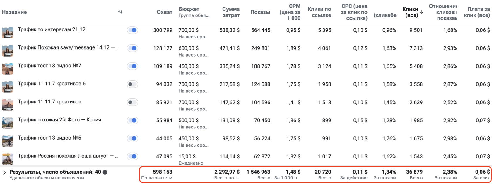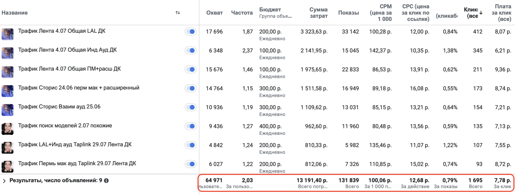 Изначально мы тестировали 13 креативов на 5 различных аудиторий. Определили, что из этого сработало лучше, и начали использовать.
