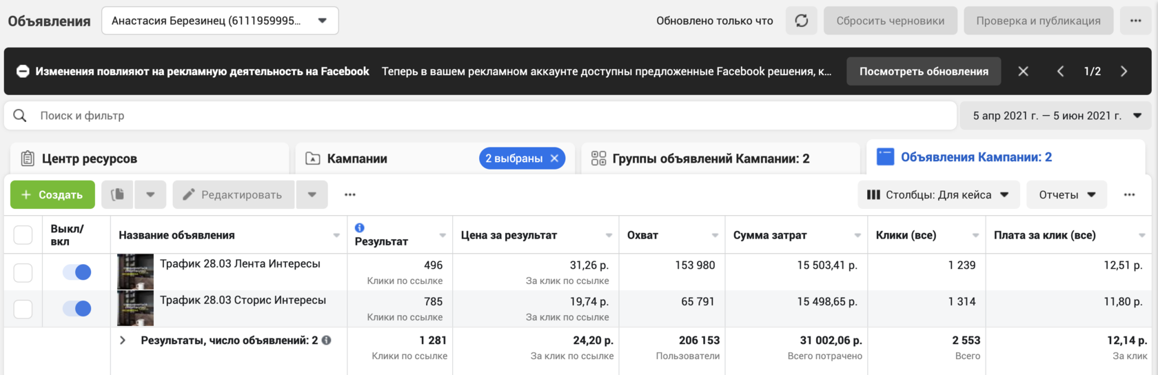 Мы работаем с Анастасией с сентября 2020 года, но этот срез сделали за период с 5 апреля 2021 года по 5 июня 2021 года специально для оформления этого кейса. Продажи были и раньше, но апрель и май оказались самыми продуктивными. Это показывает, что таргетированная реклама в соцсетях — это «игра в долгую». На тесты и гипотезы нужно время. Анастасия доверилась нам, и мы вместе добились отличного результата. Мы продолжаем сотрудничество и по сей день.